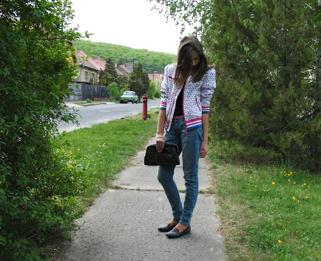 jacket: Takko/ jeans: H&M / loafer: Deichmann / belt: Charles Vogele / sunnies: Promod / clutch: Reserved / neckalce and bracelet: H&M
